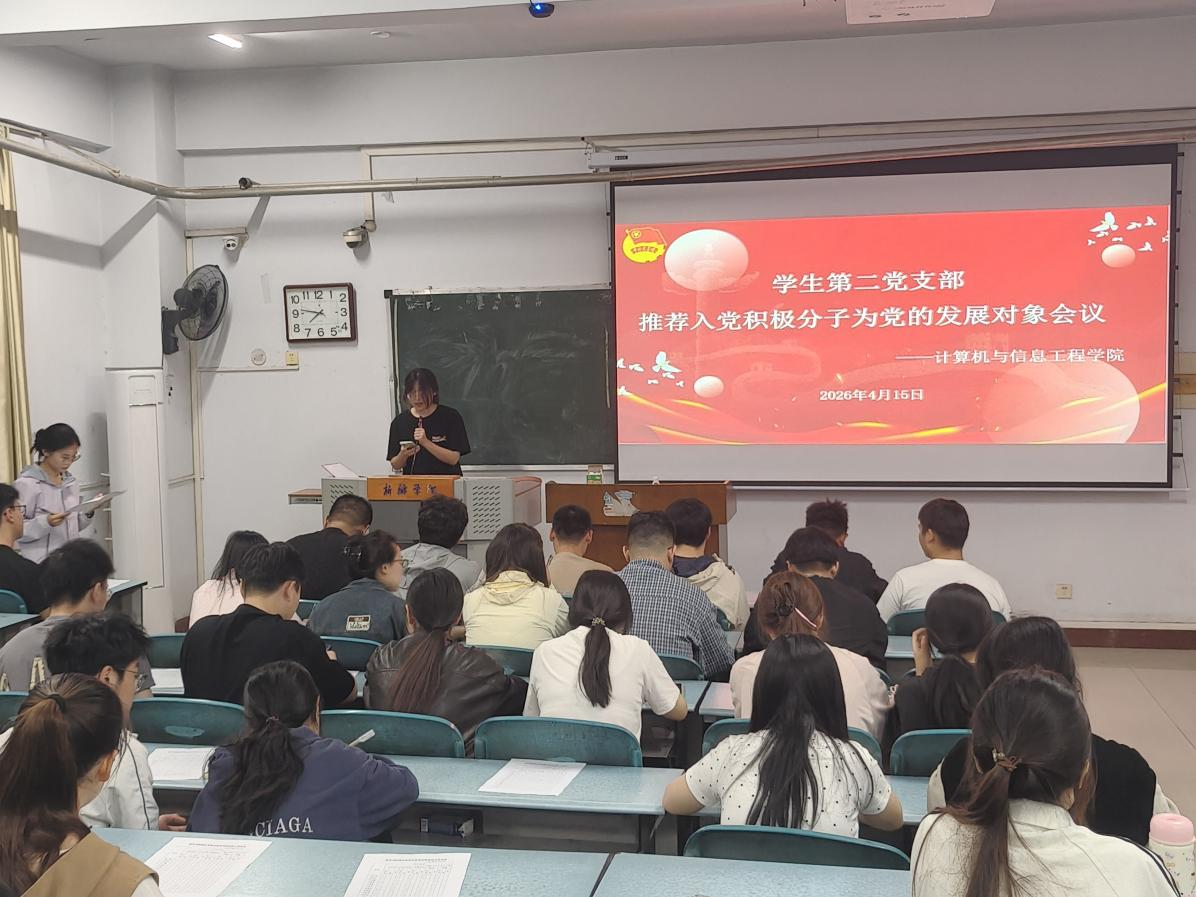 为深入学习贯彻习近平关于树立和践行正确政绩观论述,严格规范党员发展程序,强化思想引领与组织建设,计算机与信息工程学院学生第二党支部于2026年4月15日召开推荐入党积极分子为党的发展对象会议。会议由支部书记谭敬豪主持,党支部全体党员及入党积极分子共同参与。
